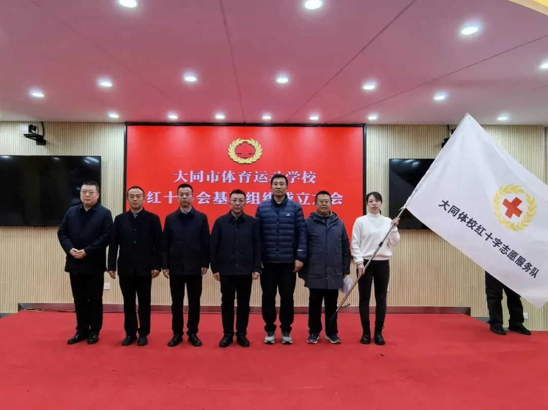 活动中,郭志清为大同市体育运动学校红十字志愿服务队授旗,并与全体参会领导合影。